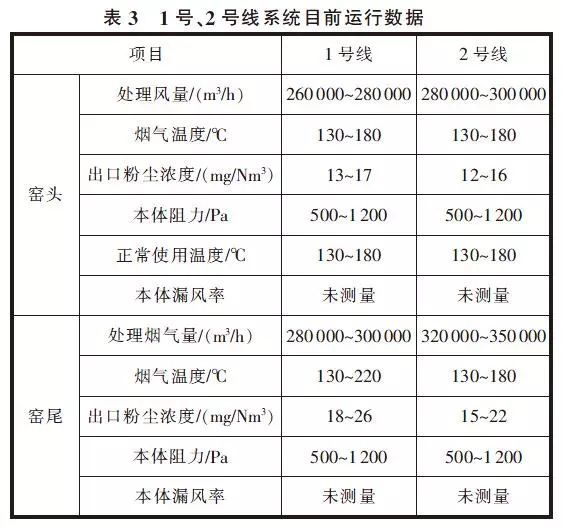 窯頭、窯尾電袋復合除塵器改造后要求達到的技術參數見表1。