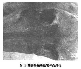 高溫燒灼的表現主要有濾袋由于高溫導致收縮劇烈,嚴重硬化,甚至濾袋表面出現破洞,主要 原因為濾袋使用的工況條件中溫度超出濾袋的承受范圍,導致出現這種現象。具體為高溫的顆粒、 高溫的煙氣、濾袋高溫熱收縮過大等造成濾料的損傷。