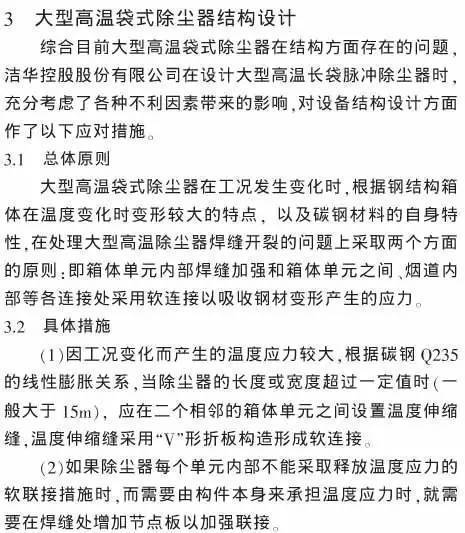 摘要:分析大型高溫袋式除塵器在結構方面存在的問題,提出設計的要點和技術措施,列舉實際應用的范例,供同行參考交流。
