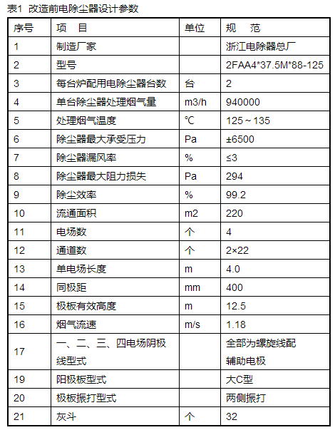 改造前,本工程配套兩臺(tái)浙江電除塵器總廠(chǎng)(即現(xiàn)在菲達(dá)環(huán)保)生產(chǎn)的2FAA4*37.5M*88-125型雙室四電場(chǎng)臥式除塵器,電除塵控制部份采用福建龍巖空氣凈化設(shè)備廠(chǎng)生產(chǎn)的GGAF02-1.0/72H型產(chǎn)品,設(shè)計(jì)除塵效率≥99.2%,極板型式為大C型板,極線(xiàn)型式為全部為螺旋線(xiàn)配輔助電極,出口設(shè)槽極板,振打方式全部采用側(cè)部饒臂錘振打。其一、二、三、四電場(chǎng)高壓供電和控制裝置是GGAJ02-1.0/72CG型的整流變壓器。本工程改造前電除塵器設(shè)計(jì)參數(shù)見(jiàn)表1。