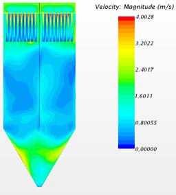 另,通過對除塵器內部流場CFD分析對比得知,將濾袋替換為濾筒后,內部流場大為改善,大幅減少濾芯底部的沖刷,提高了使用壽命。在濾筒的下方區域形成較大的灰塵沉降區,利于大顆粒的預沉降,除塵效果更加優異。