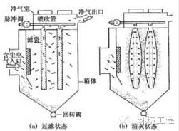 除塵器主要由上箱體、中箱體、灰斗、進風均流管、支架濾袋及噴吹裝置、卸灰裝置等組成。含塵氣體從除塵器的進風均流管進入各分室灰斗,并在灰斗導流裝置的導流下,大顆粒的粉塵被分離,直接落入灰斗,而較細粉塵均勻地進入中部箱體而吸附在濾袋的外表面上,干凈氣體透過濾袋進入上箱體,并經各離線閥和排風管排入大氣。隨著過濾工況的進行,濾袋上的粉塵越積越多,當設備阻力達到限定的阻力值(一般設定為1500Pa )時,由清灰控制裝置按差壓設定值或清灰時間設定值自動關閉一室離線閥后,按設定程序打開電控脈沖閥,進行停風噴吹,利用壓縮空氣瞬間噴吹使濾袋內壓力聚增,將濾袋上的粉塵進行抖落(即使粘細粉塵亦能較徹底地清灰)至灰斗中,由排灰機構排出。